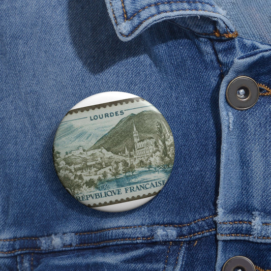 Frimärke ur Gösta Bodmans filatelistiska motivsamling, påbörjad 1950.Frimärke från Frankrike, 1954. Motiv av kyrkan vid Lourdes. "Undergörande vatten". Pin Buttons with Crisp Design