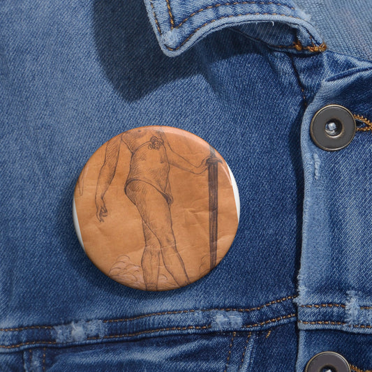 A drawing of an angel holding a sword. Woman breasts sword, beauty fashion. Pin Buttons with Crisp Design