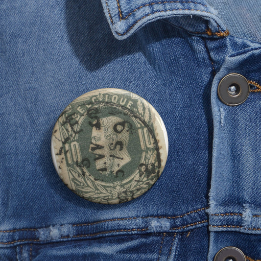 Frimärke ur Gösta Bodmans filatelistiska motivsamling, påbörjad 1950.Frimärke från Belgien, 1869. Motiv av lagerkvistar. "Kung Léopold II". Pin Buttons with Crisp Design