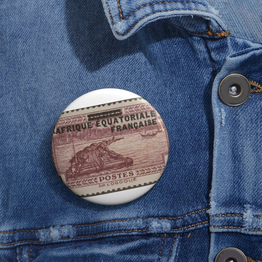 Frimärke ur Gösta Bodmans filatelistiska motivsamling, påbörjad 1950.Frimärke från Franska Ekvatorialafrika, 1936. Motiv av verkestransport vid floden L'Ogooué, Franska Kongo, Pin Buttons with Crisp Design