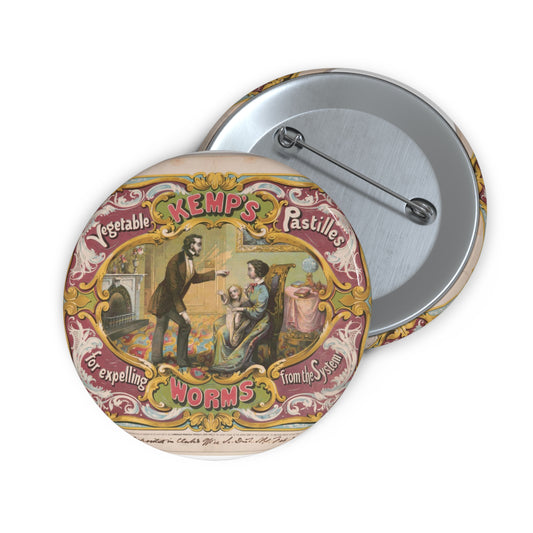 Kemp's vegetable pastilles for expelling worms from the system / lith. of Snyder, Black & Sturn 92 William St. New York. Pin Buttons with Crisp Design