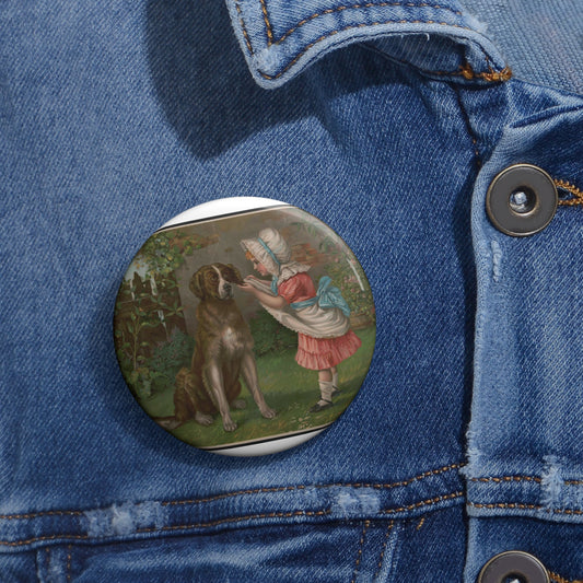 Girl in pink dress and white bonnet with dog Pin Buttons with Crisp Design