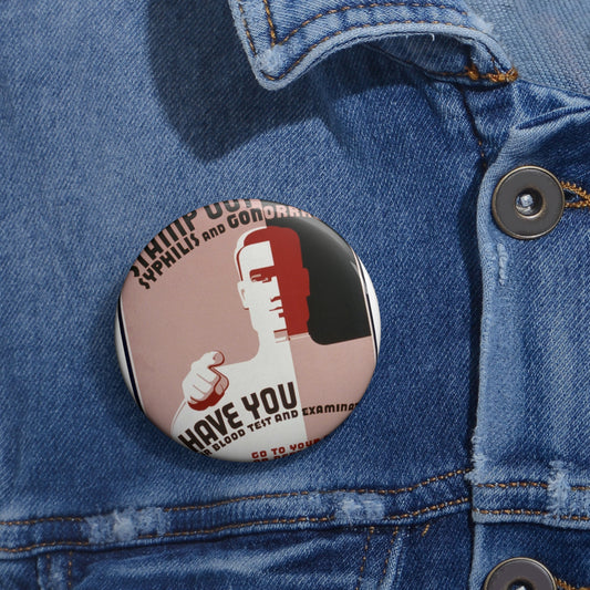Stamp out syphilis and gonorrhea Have you had your blood test and examination : Go to your doctor or Dept. of Health. Pin Buttons with Crisp Design