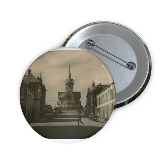 Kirkegata i Hammerfest før ødeleggelsene under andre verdenskrig. Blikket er rettet oppover bakken, mot kirka. En person kryssen veien. Pin Buttons with Crisp Design