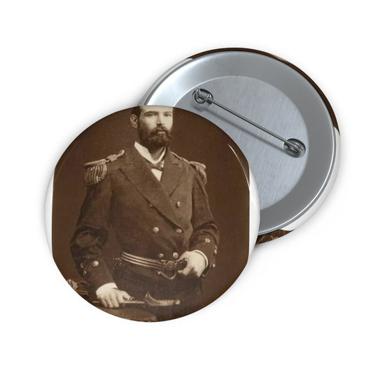 Foto A.Prat - A black and white photo of a man in uniform Pin Buttons with Crisp Design