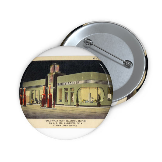 Roarin' Rohrer, Oklahoma's most beautiful station on U.S. 270, McAlester, Okla., stream lined service Pin Buttons with Crisp Design