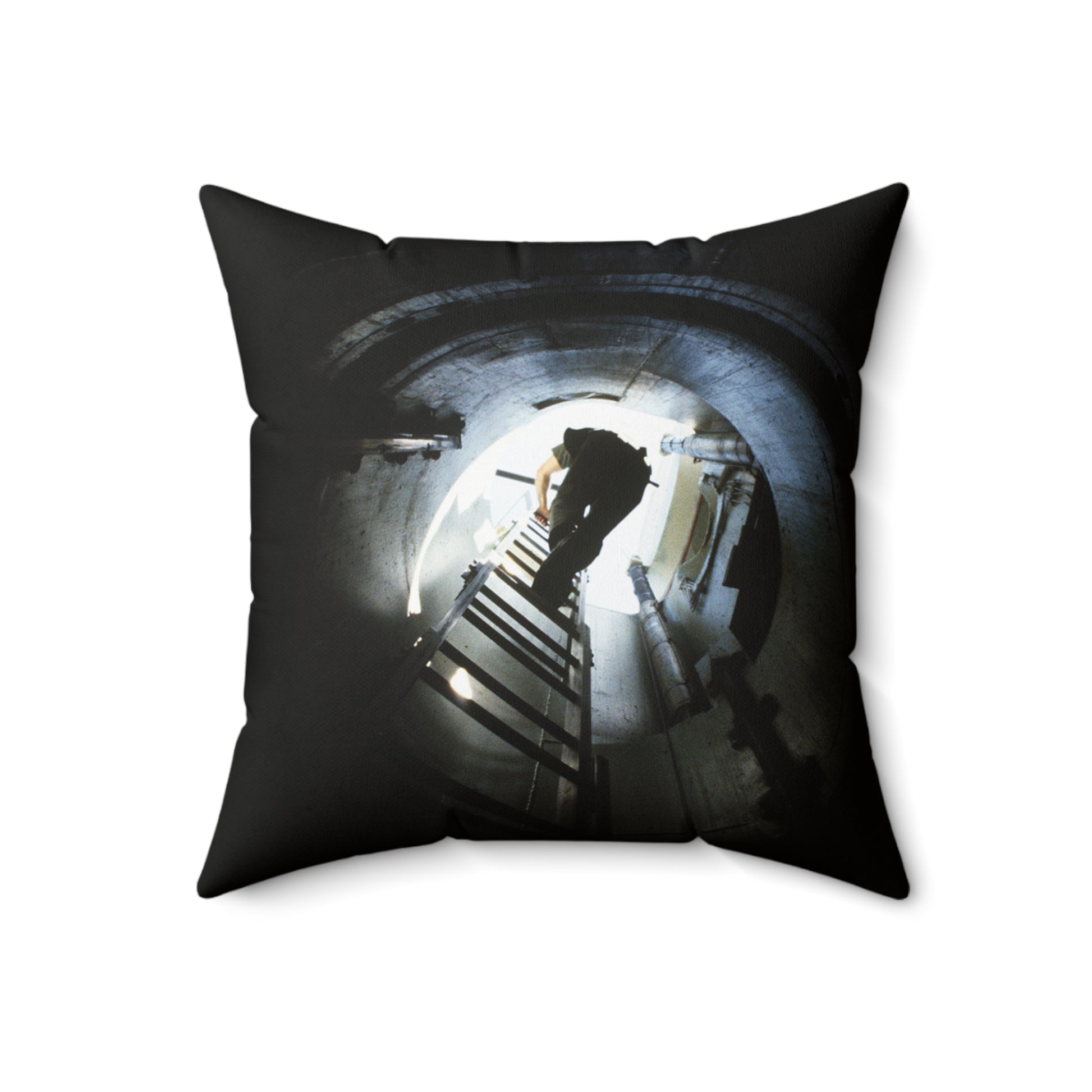 A 44th Field Missile Maintenance Squadron maintenance technician climbs down a ladder into a Minuteman missile support facility Decorative Accent Square Pillow