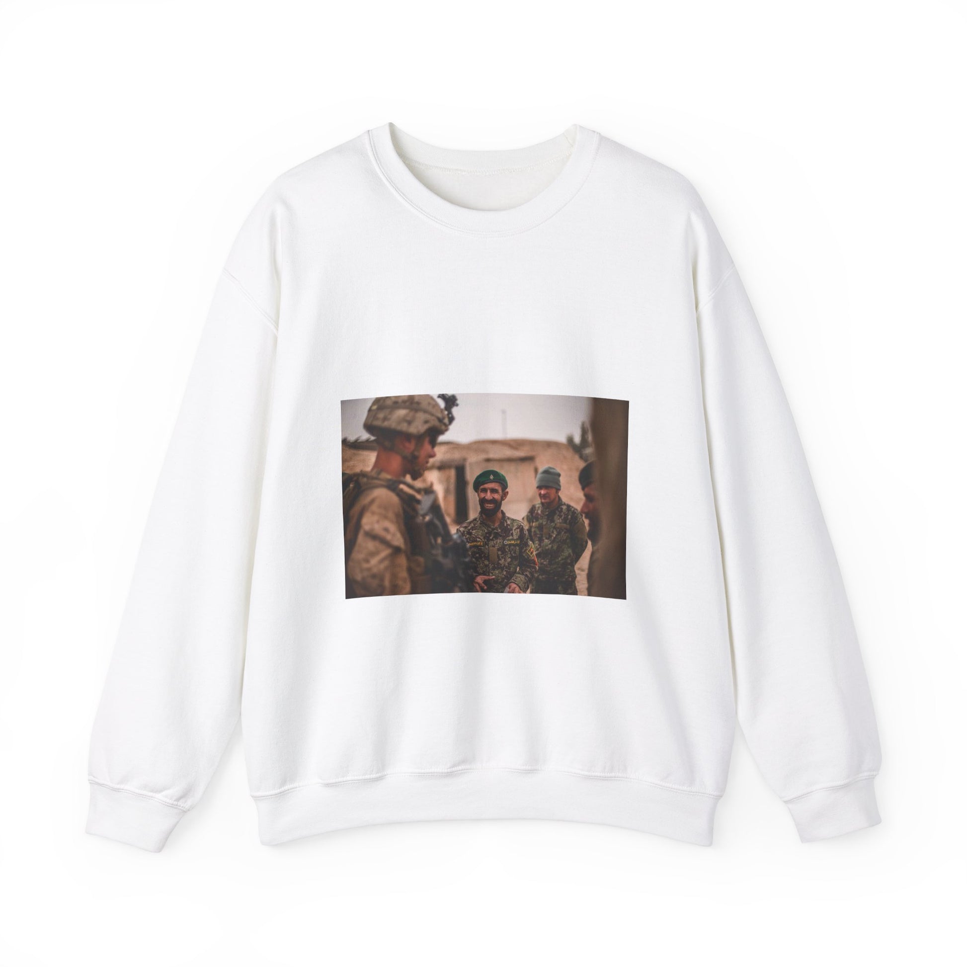 A U.S. Marine with Task Force Southwest (TFSW) converses White Heavy Blend Adult Crew Neck SweatShirt