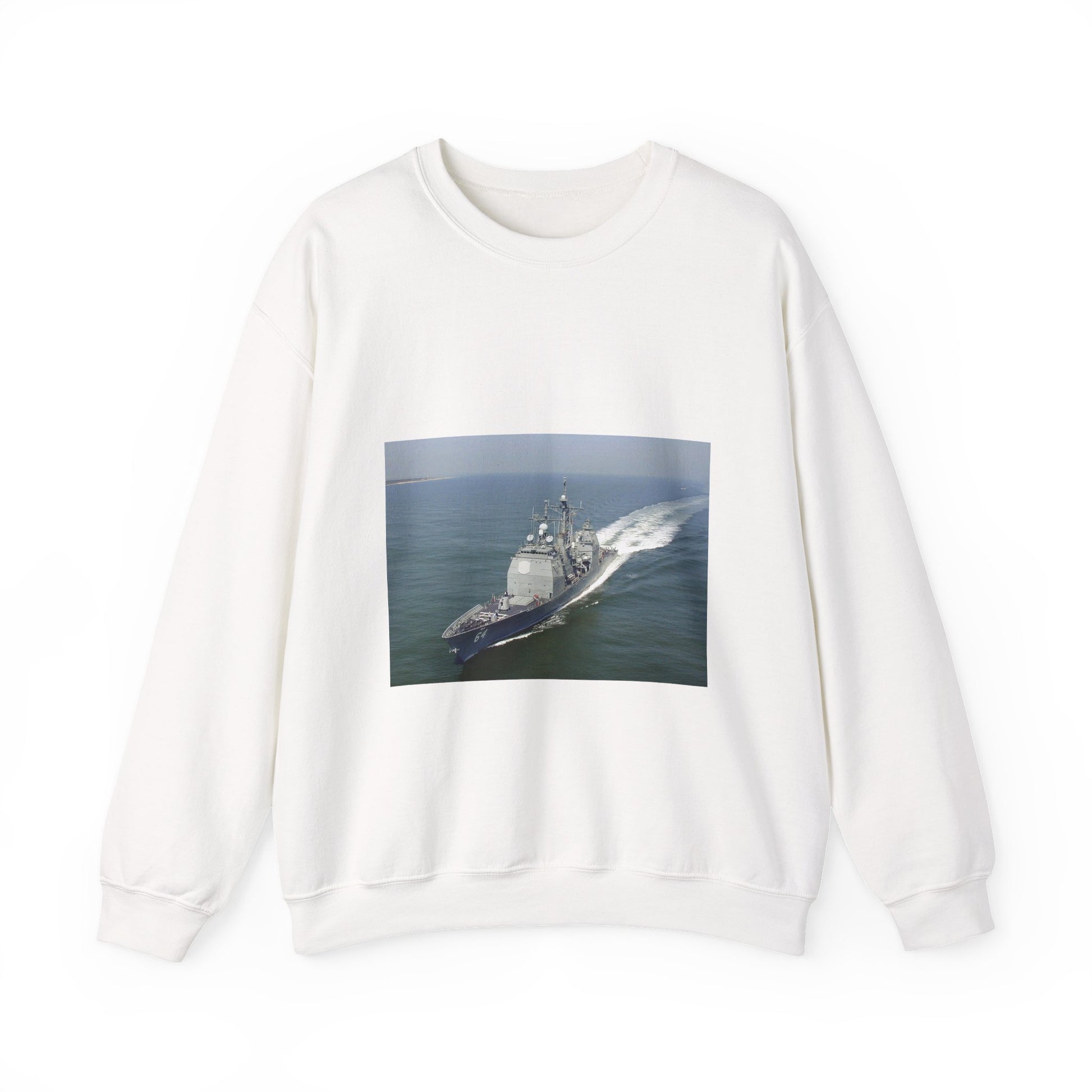 Aerial port bow view of the guided missile cruiser USS GETTYSBURG (CG 64) underway off Fort Story, Virginia White Heavy Blend Adult Crew Neck SweatShirt