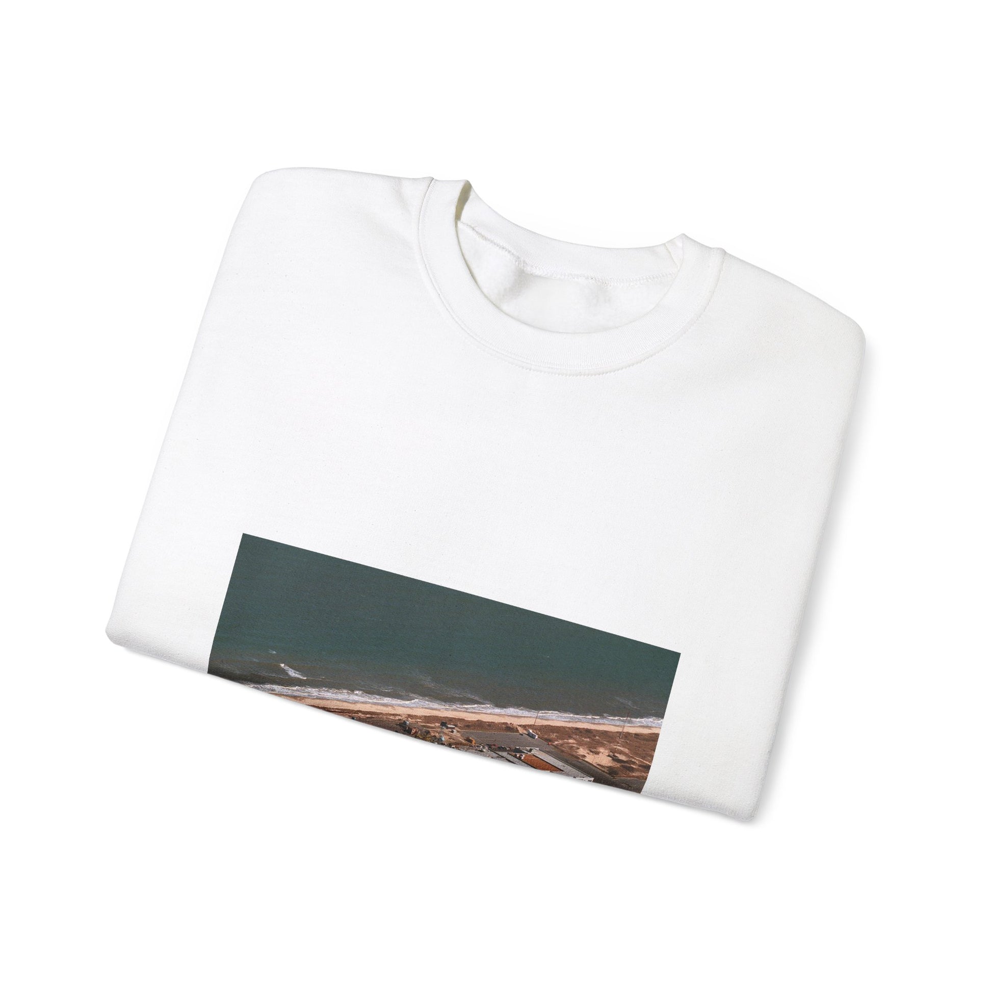 An aerial view of the Naval Surface Warfare Center testing building on the Dam Neck Naval Base. Along the beach are various types of gun mounts with their associated fire control radars atop the test building White Heavy Blend Adult Crew Neck SweatShirt