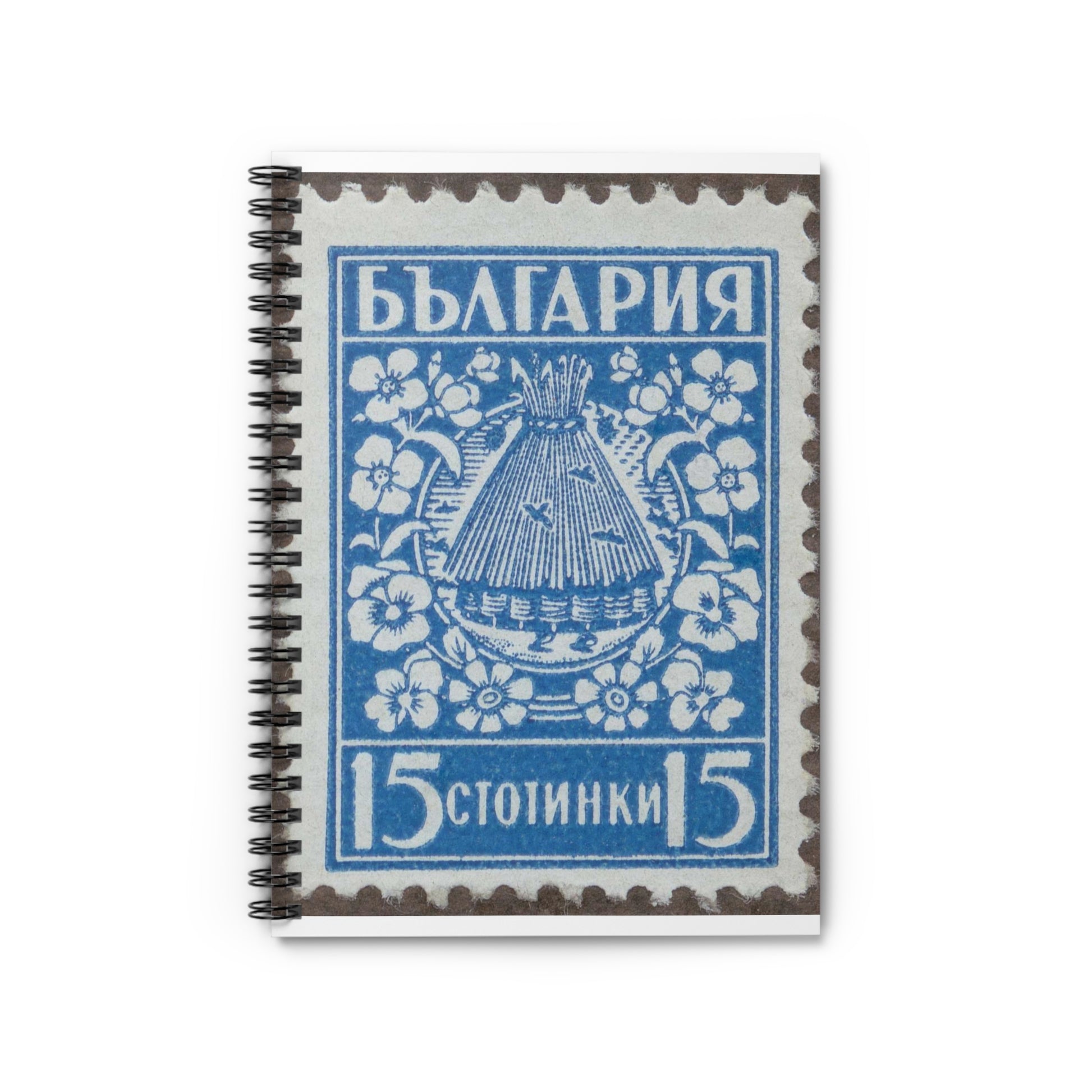 Frimärke ur Gösta Bodmans filatelistiska motivsamling, påbörjad 1950.Frimärke från Bulgarien, 1940. Motiv av bikupa. "Lanbrukspropaganda". Spiral Bound Ruled Notebook with Printed Cover