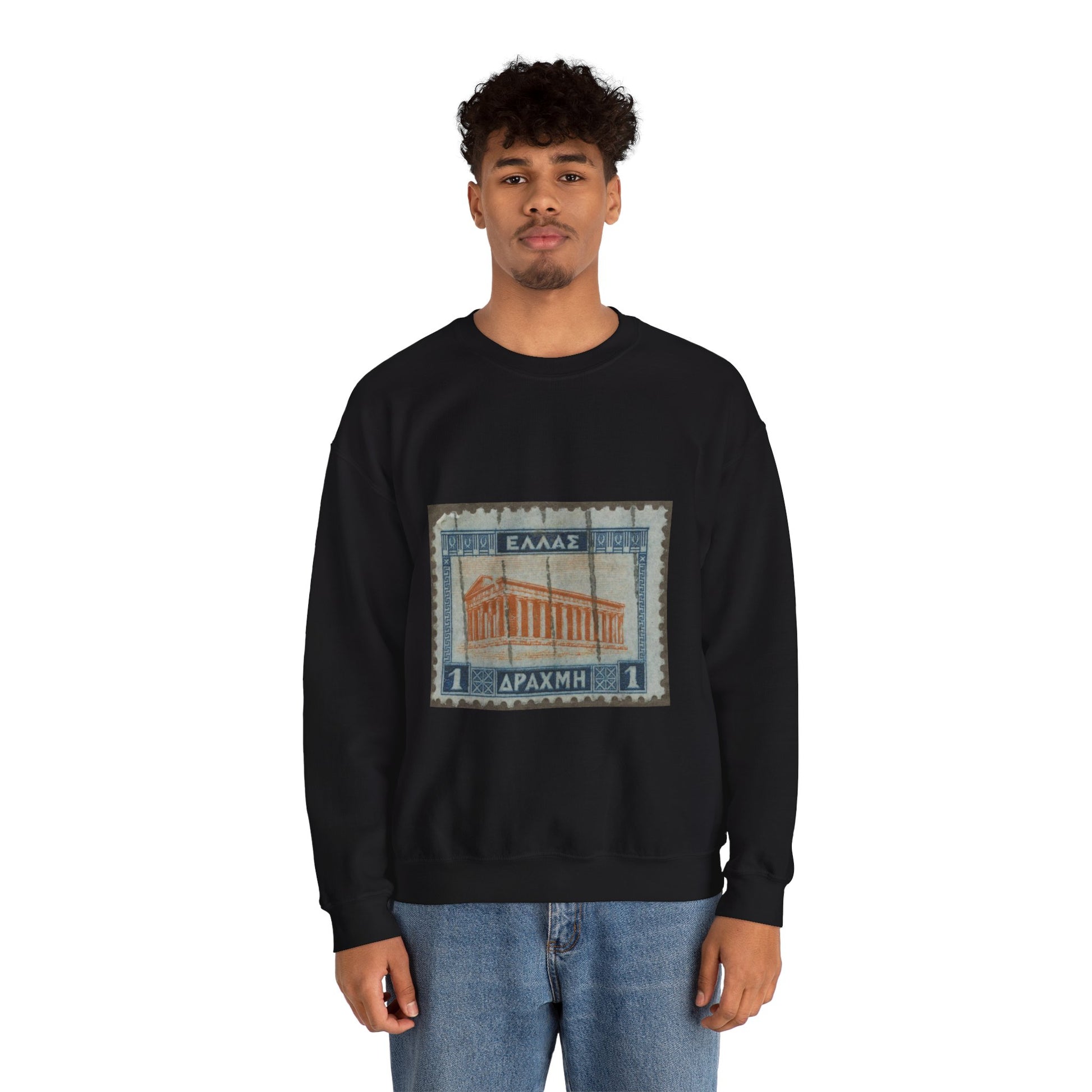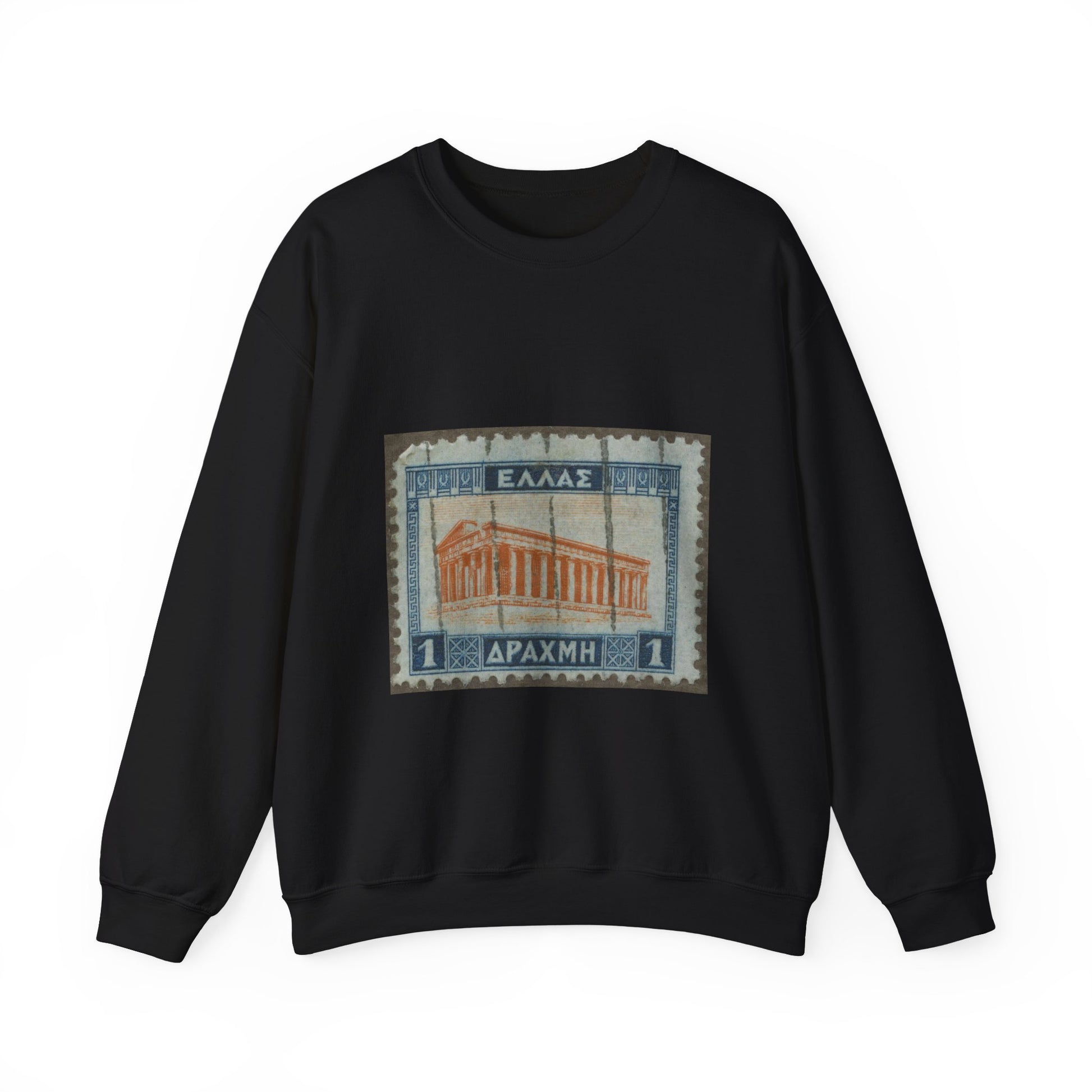 Frimärke ur Gösta Bodmans filatelistiska motivsamling, påbörjad 1950.Frimärke från Grekland, 1927. Motiv av Theseustemplet i Atèn. Black Heavy Blend Adult Crew Neck SweatShirt