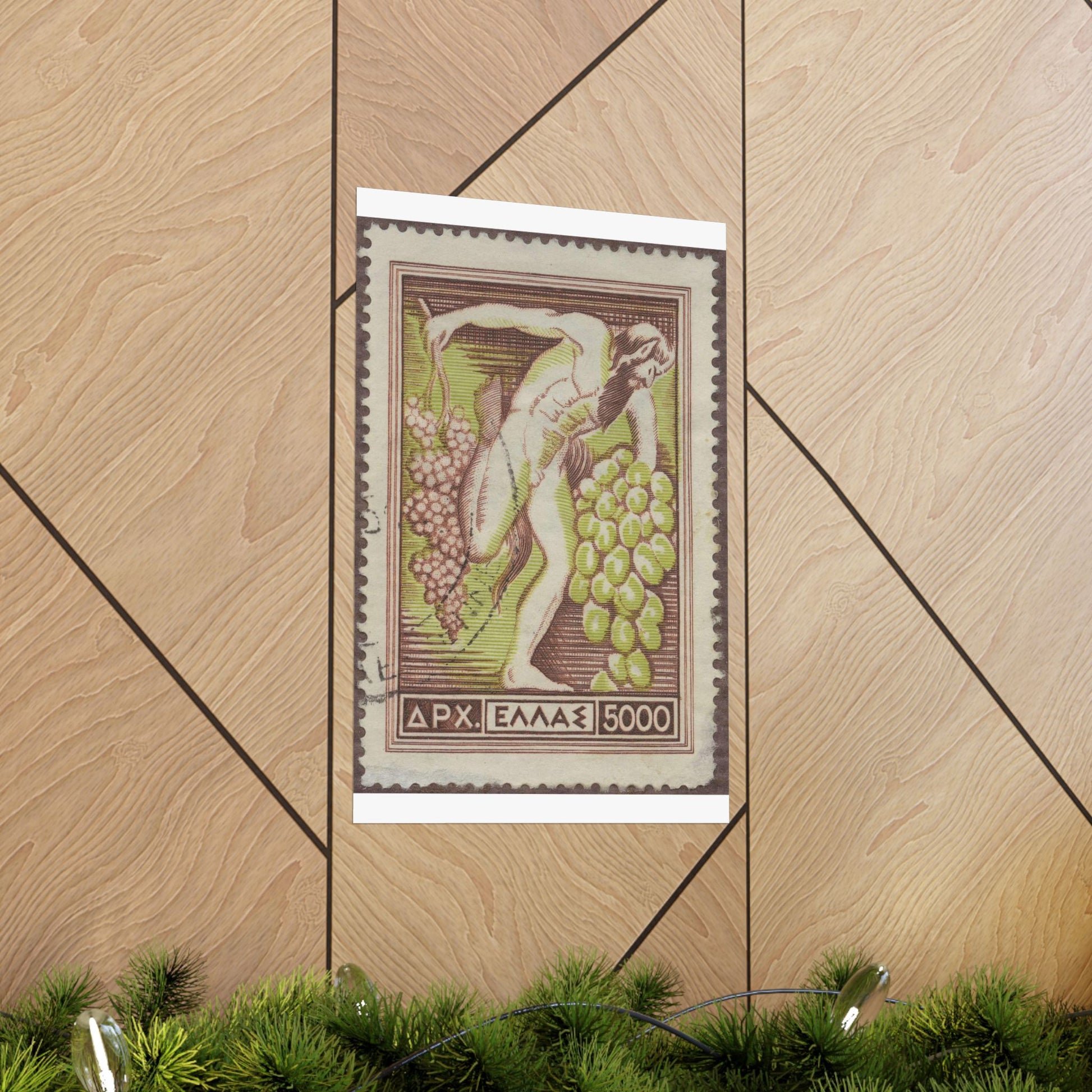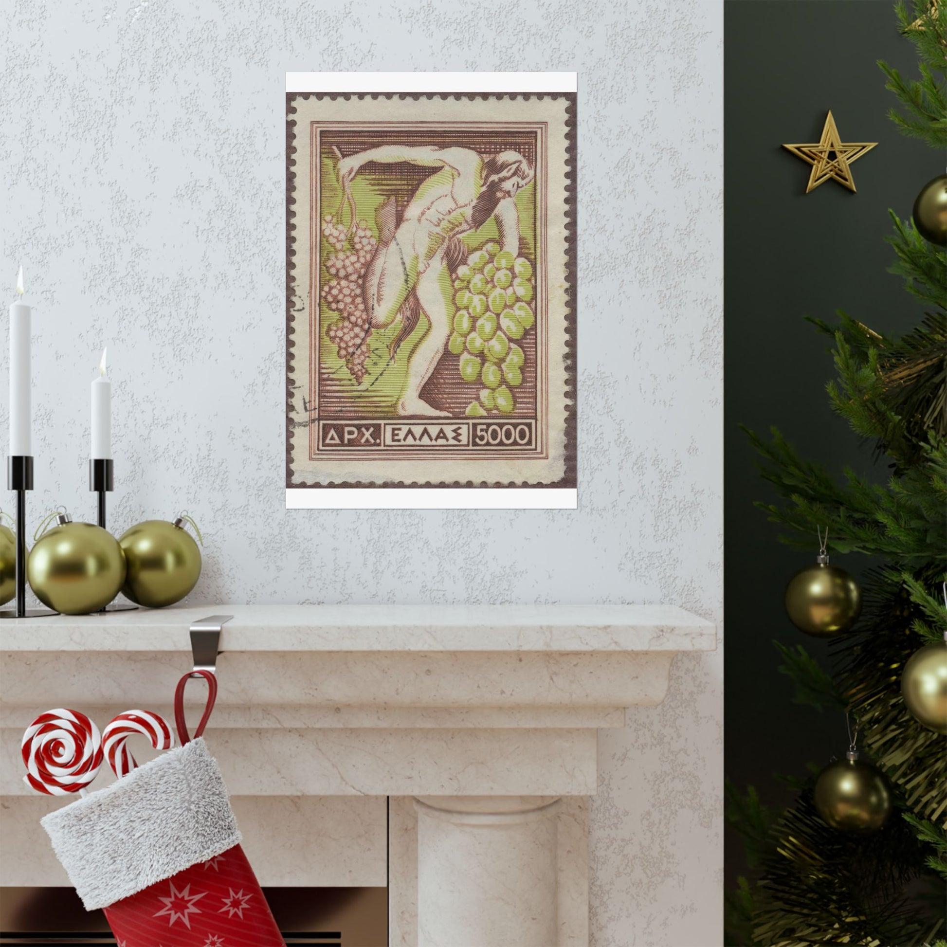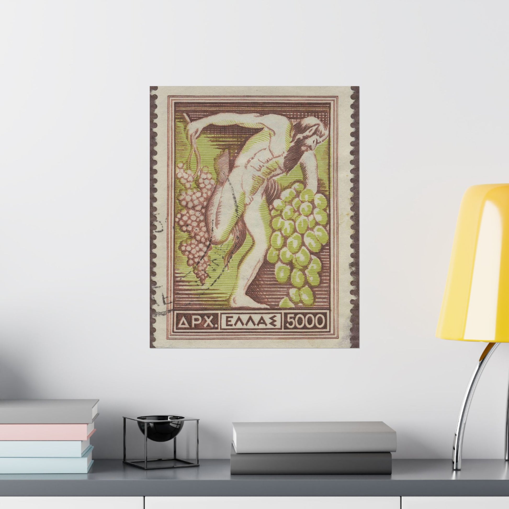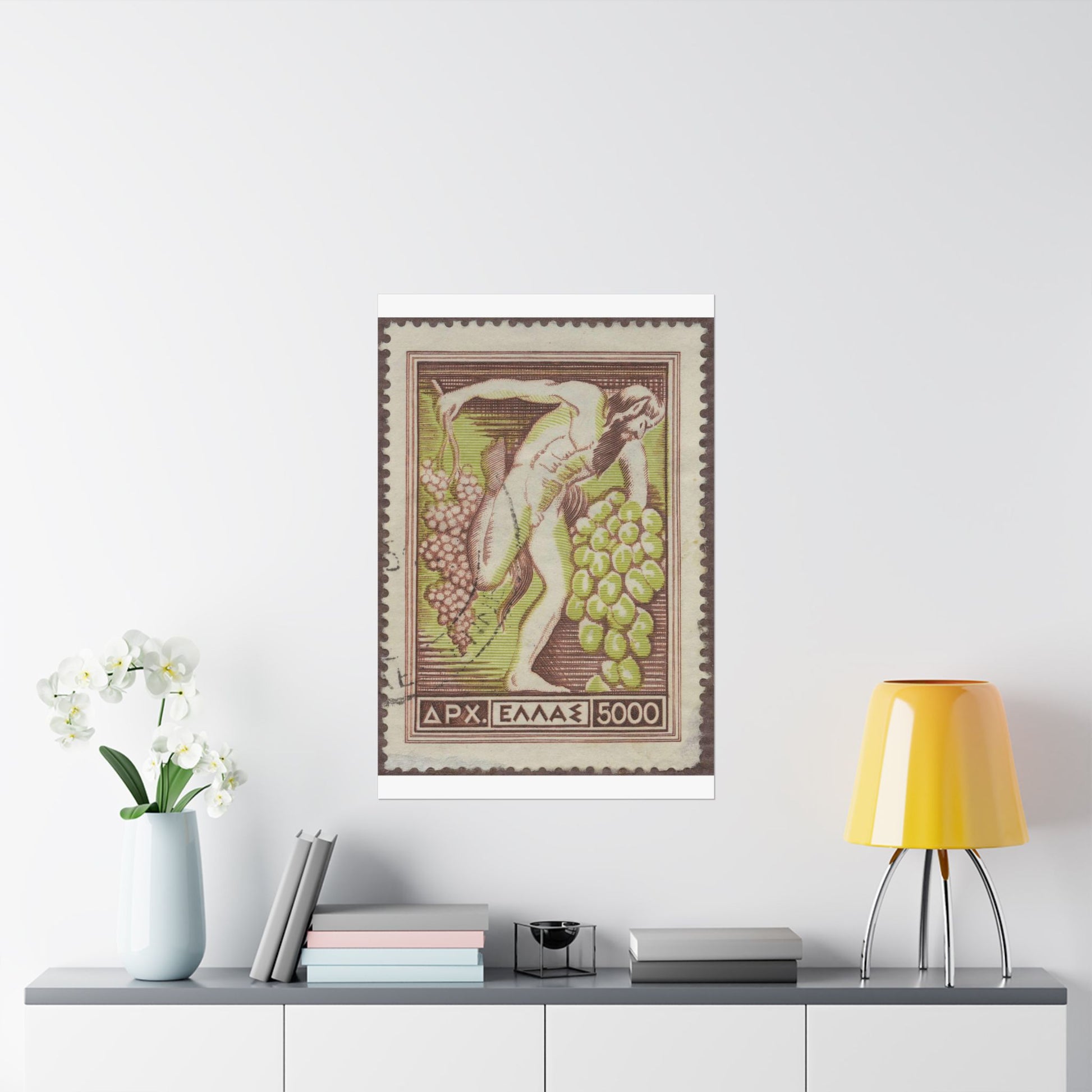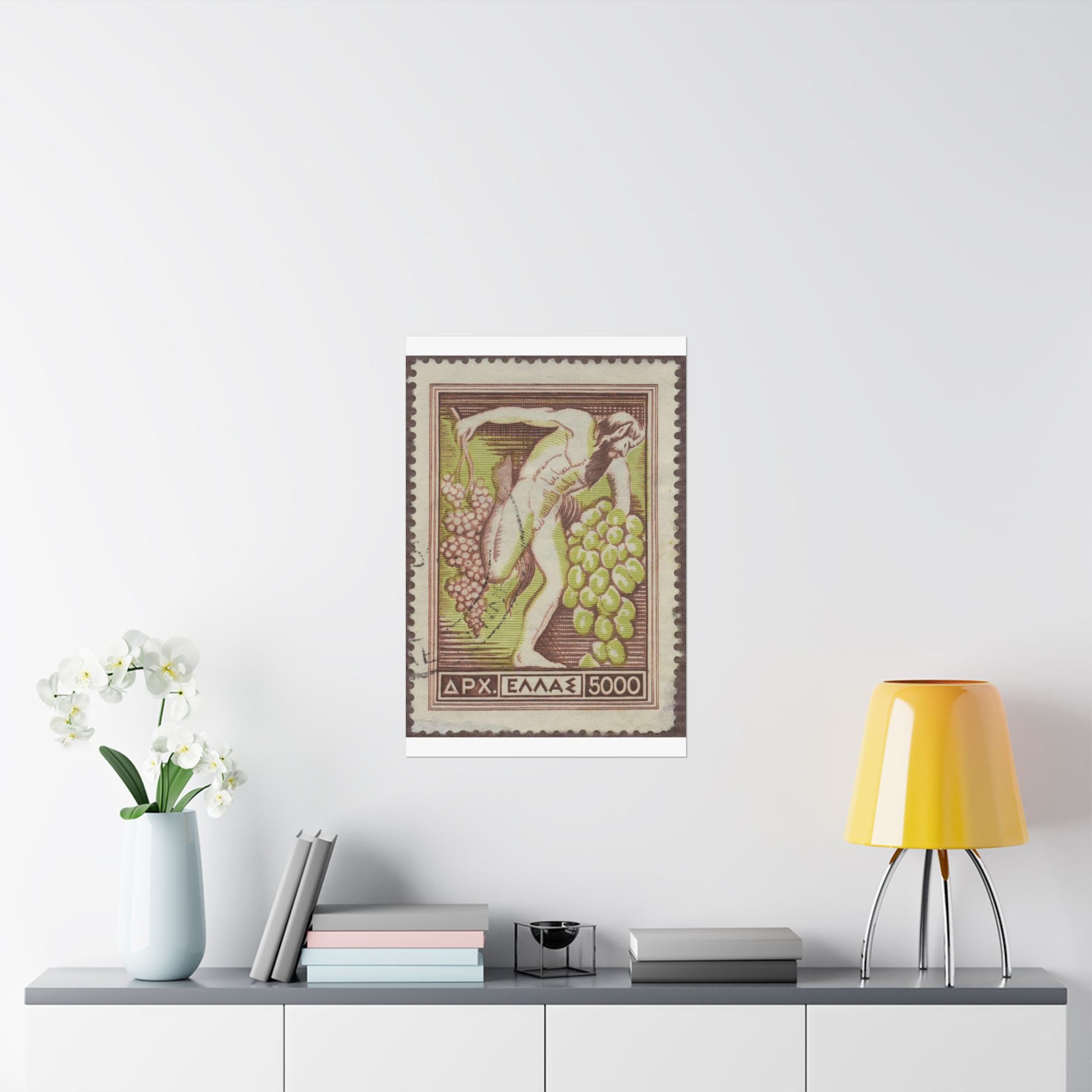 Frimärke ur Gösta Bodmans filatelistiska motivsamling, påbörjad 1950.Frimärke från Grekland, 1953. Motiv av Bacchus med vindruvsklasar. High Quality Matte Wall Art Poster for Home, Office, Classroom