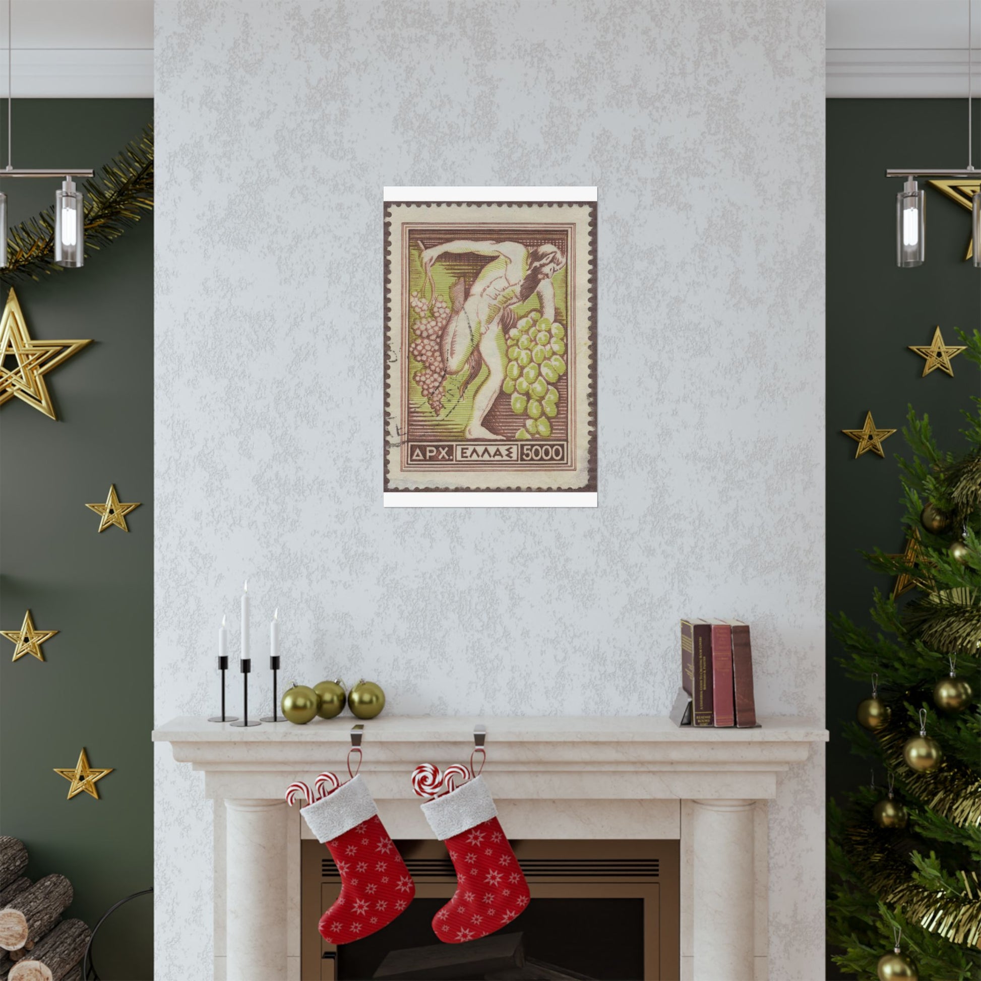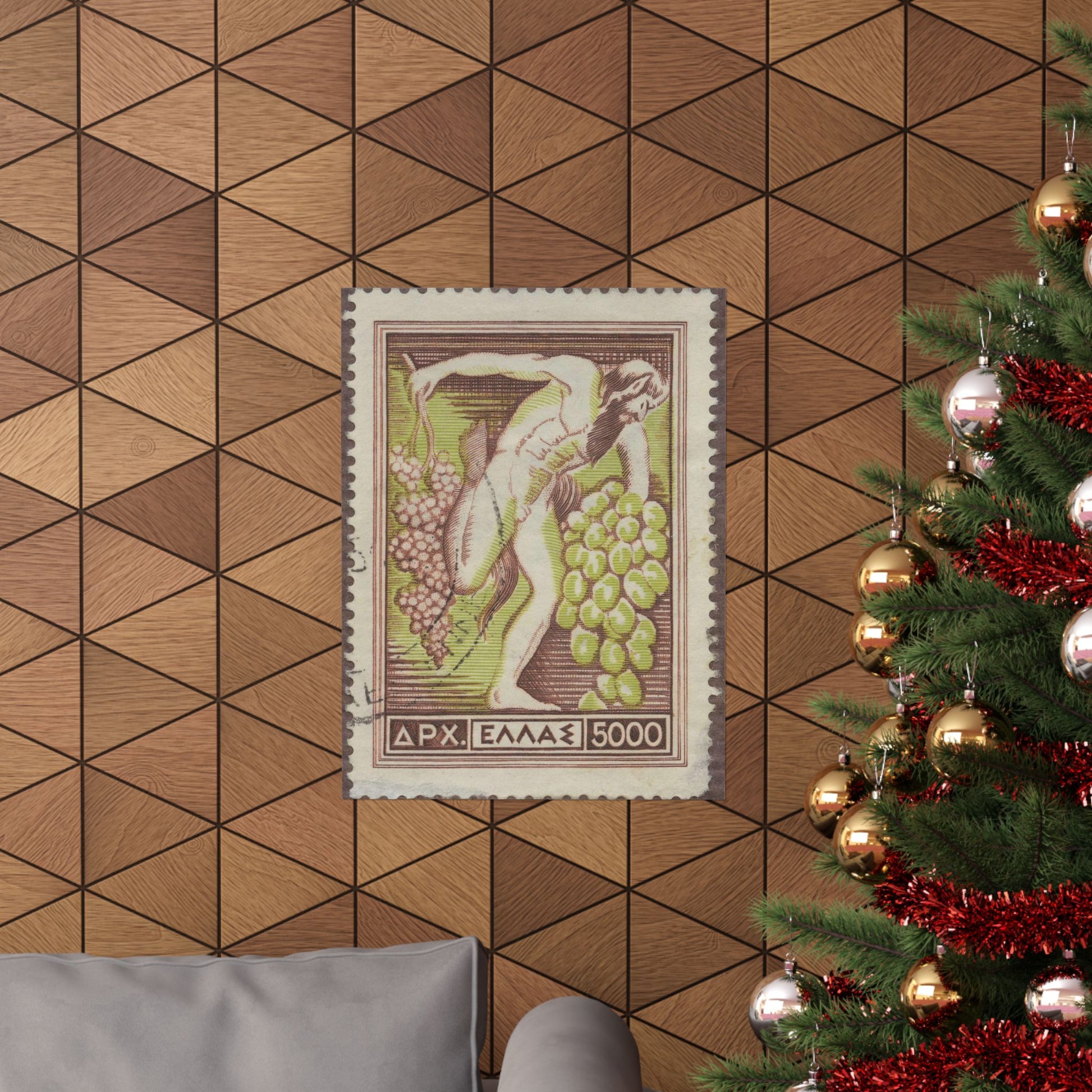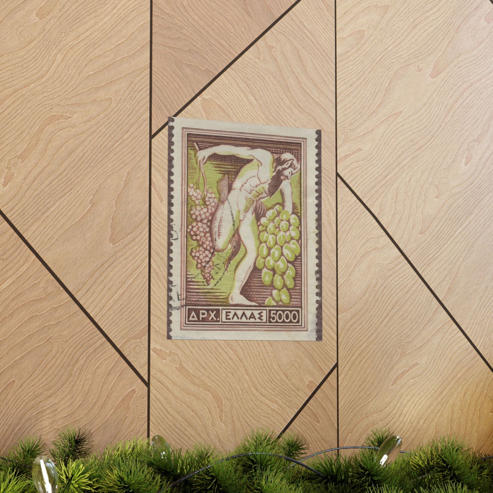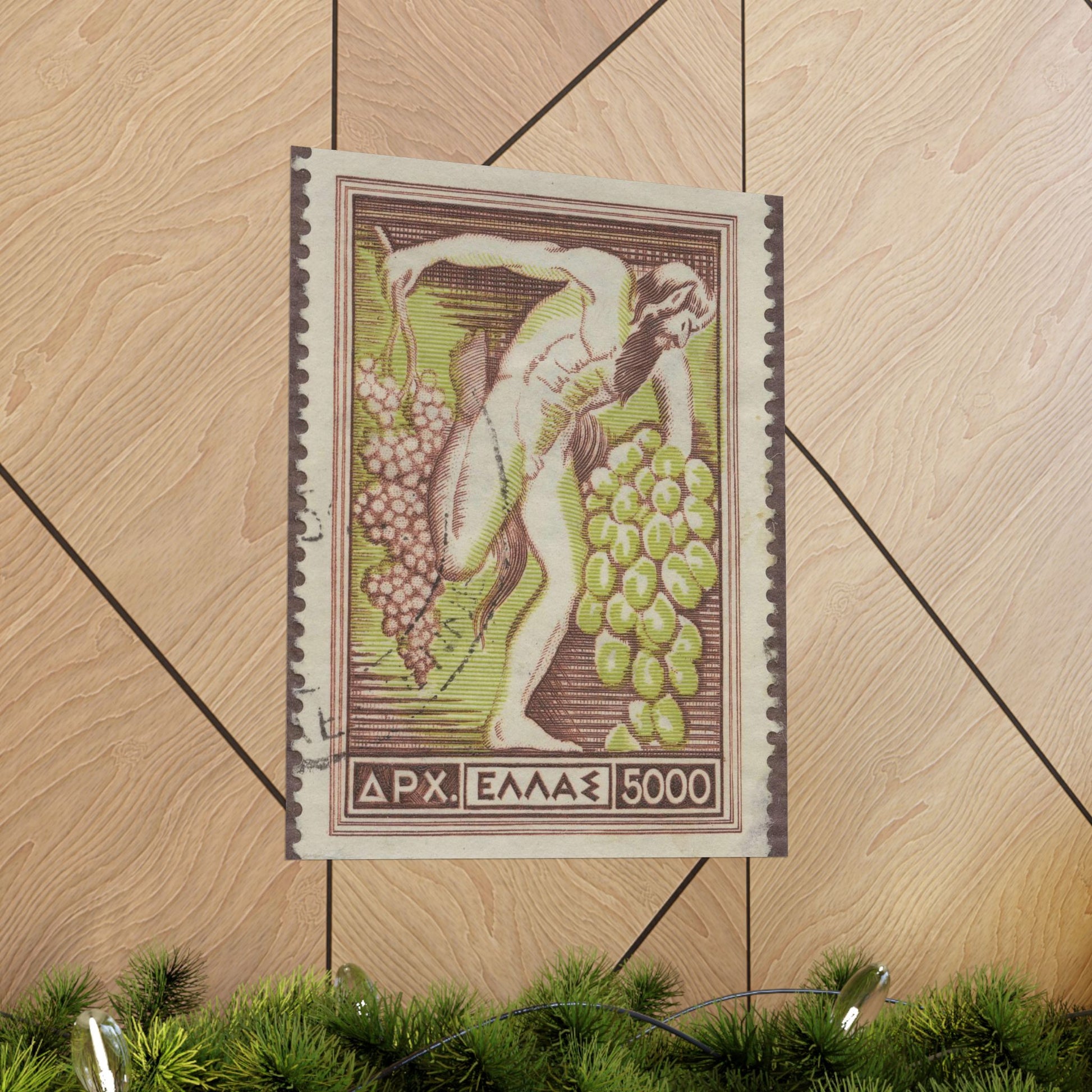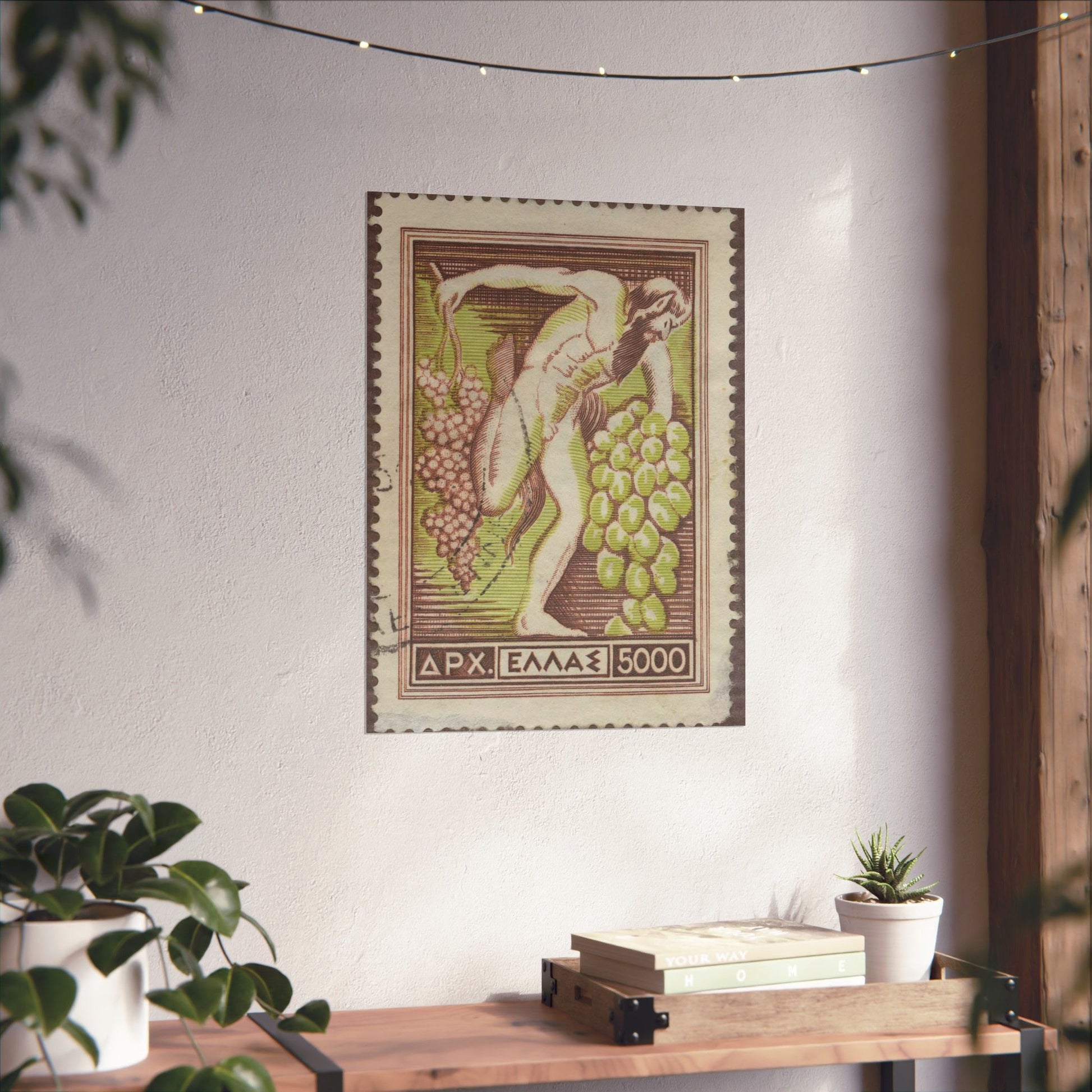 Frimärke ur Gösta Bodmans filatelistiska motivsamling, påbörjad 1950.Frimärke från Grekland, 1953. Motiv av Bacchus med vindruvsklasar. High Quality Matte Wall Art Poster for Home, Office, Classroom