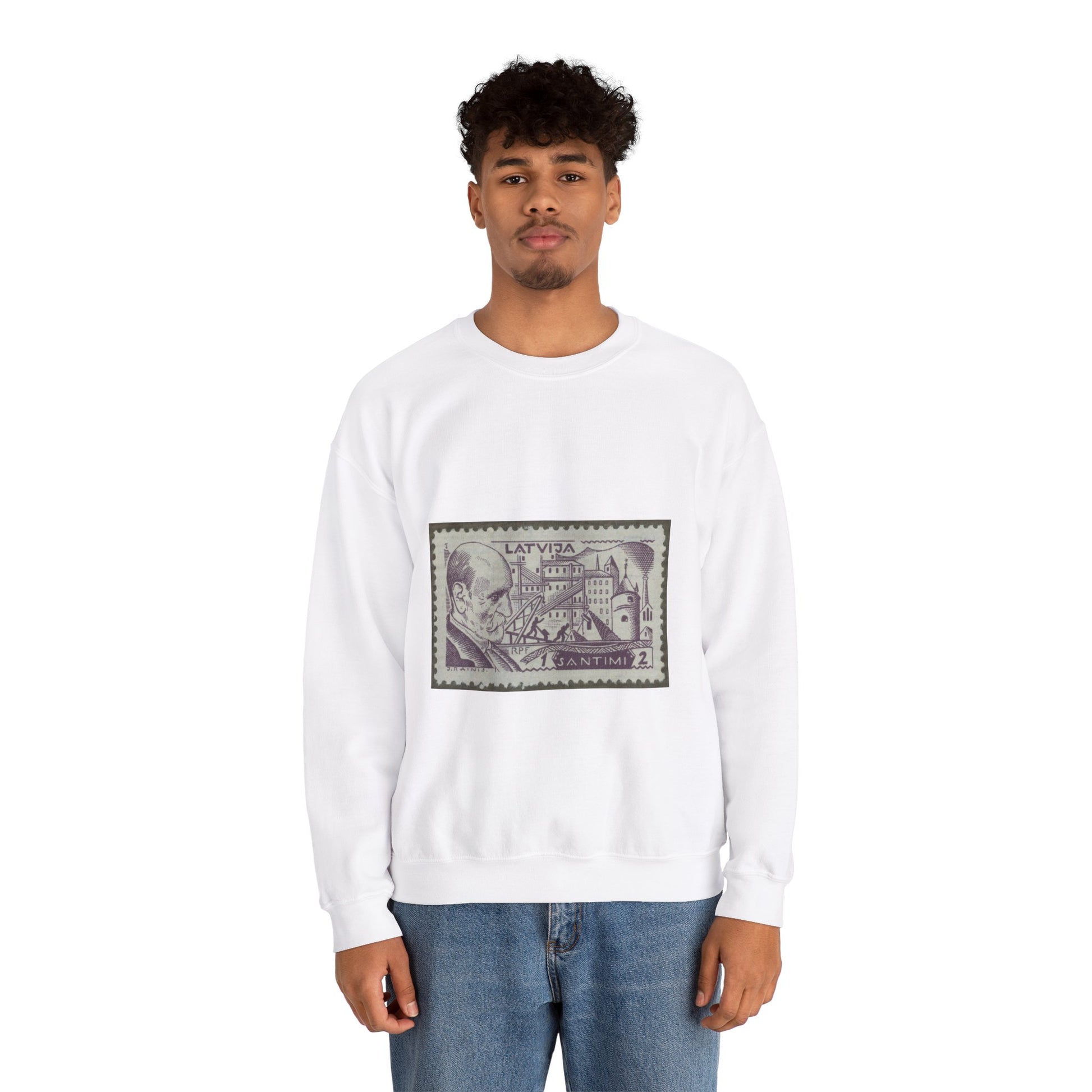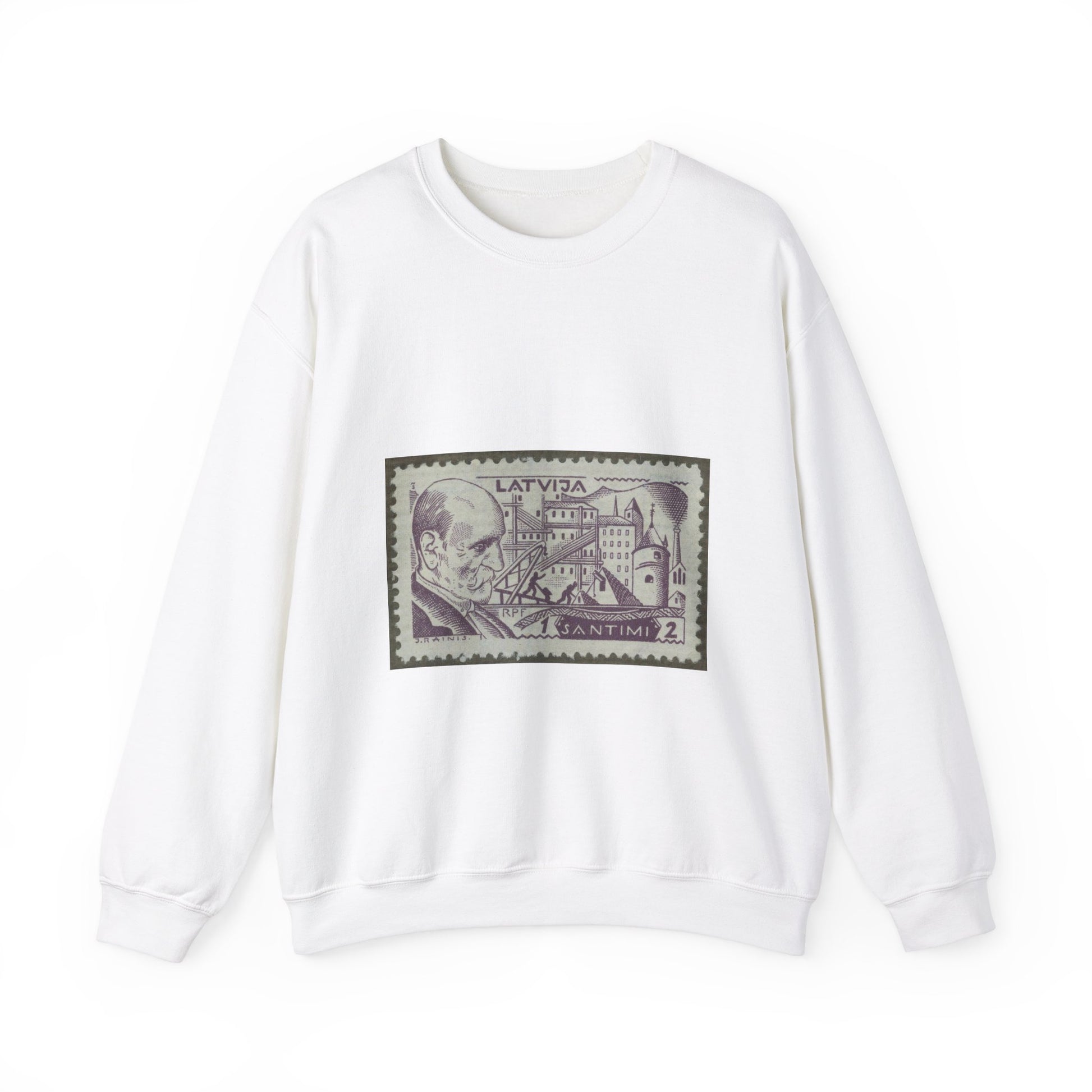 Frimärke ur Gösta Bodmans filatelistiska motivsamling, påbörjad 1950.Frimärke från Lettland, 1930. Motiv av byggnadsarbetare för ett monument över författare Rainis. White Heavy Blend Adult Crew Neck SweatShirt