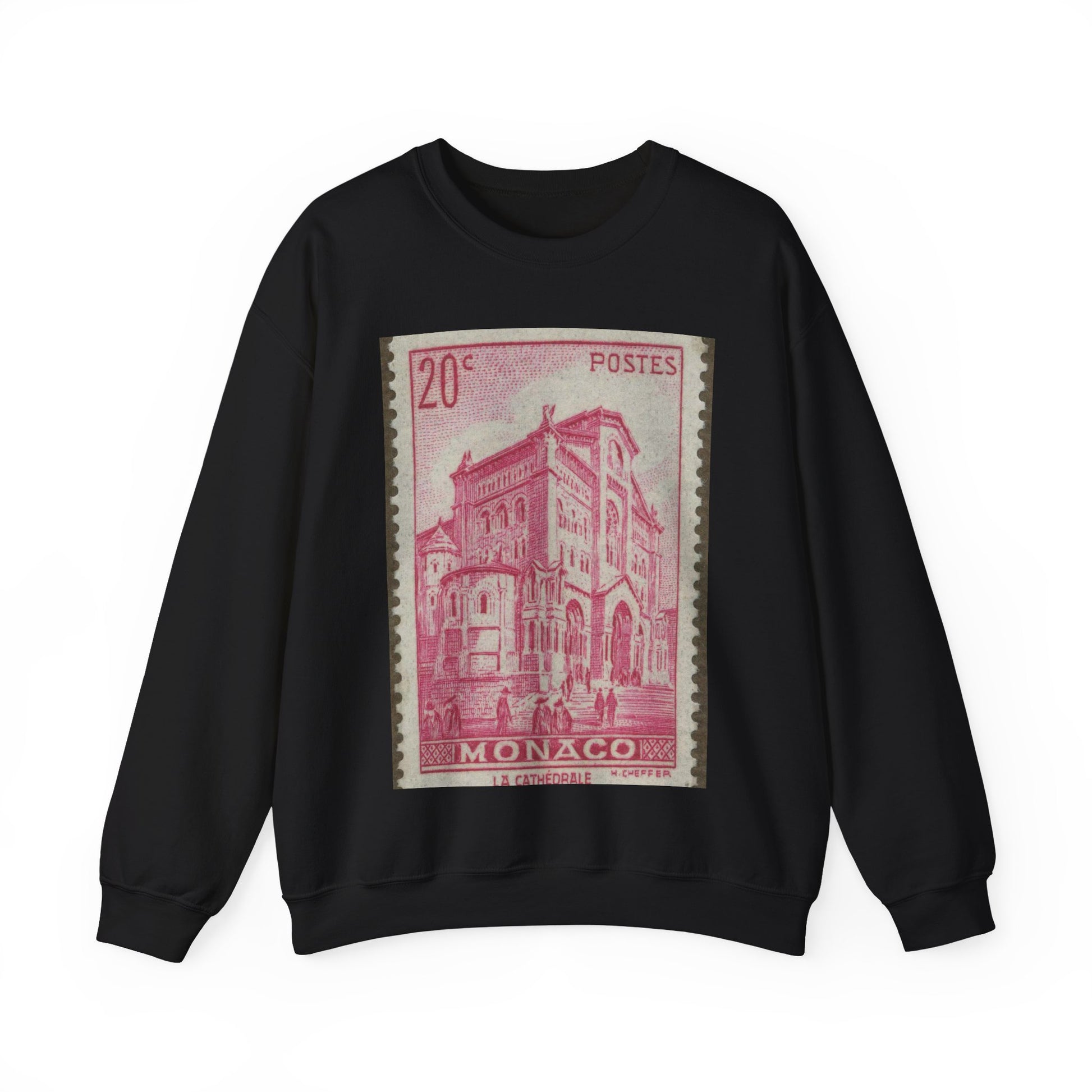 Frimärke ur Gösta Bodmans filatelistiska motivsamling, påbörjad 1950.Frimärke från Monaco, 1939. Motiv av katedralen i Monaco. Black Heavy Blend Adult Crew Neck SweatShirt