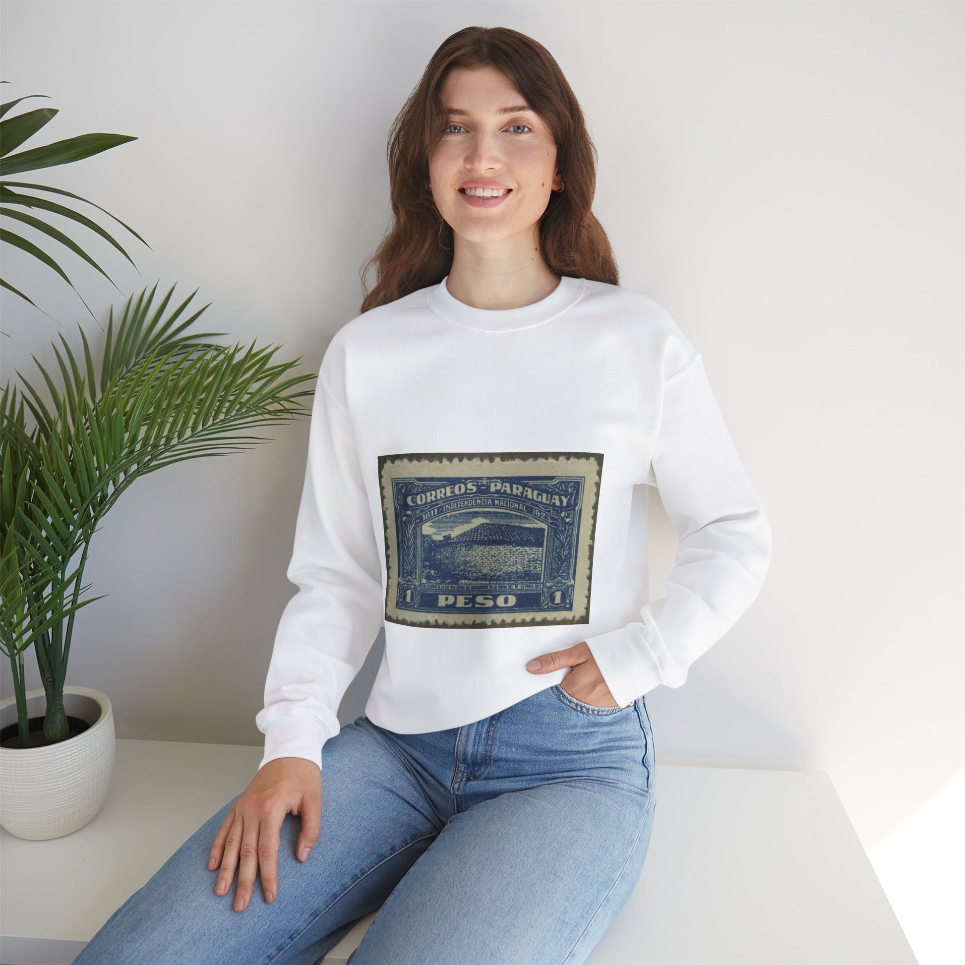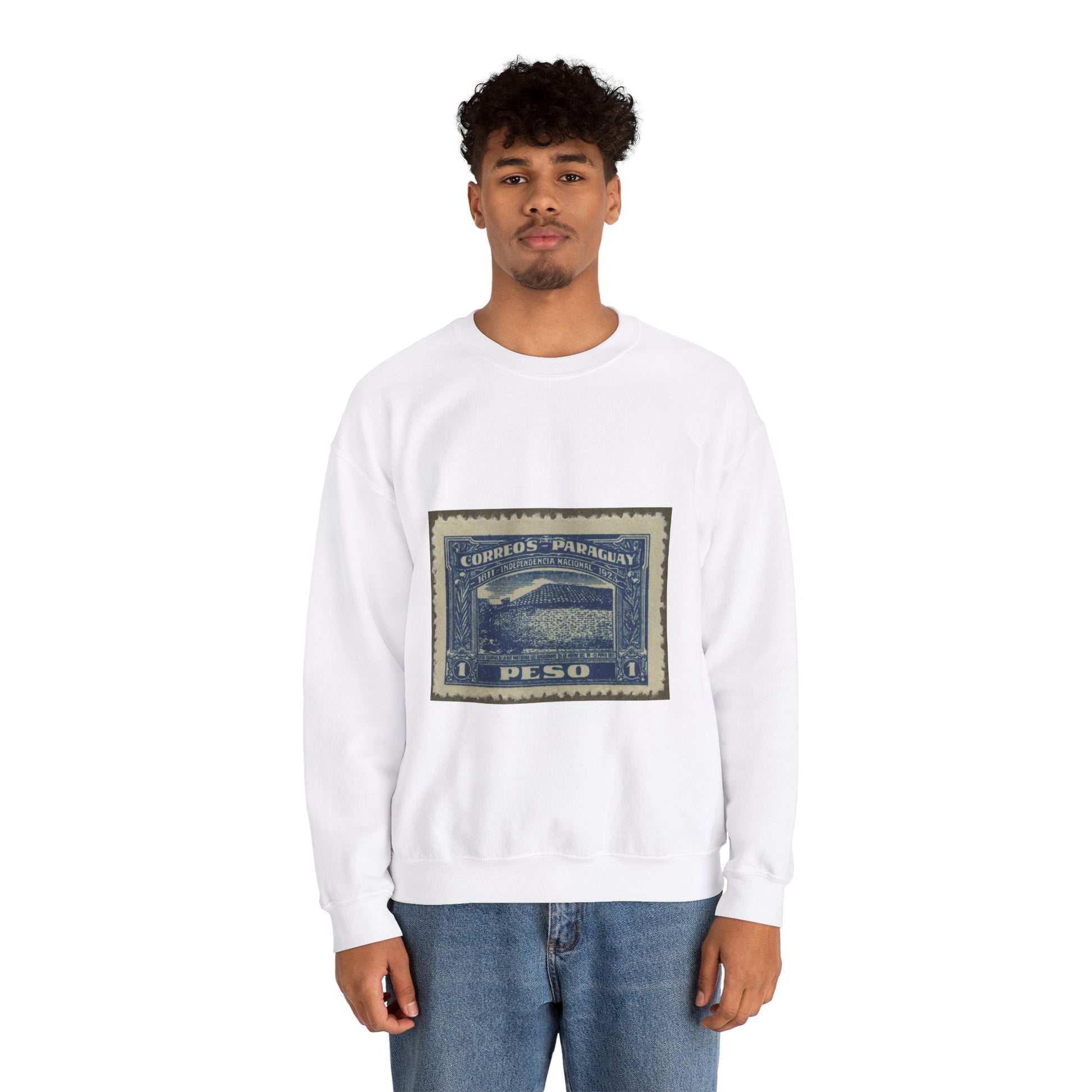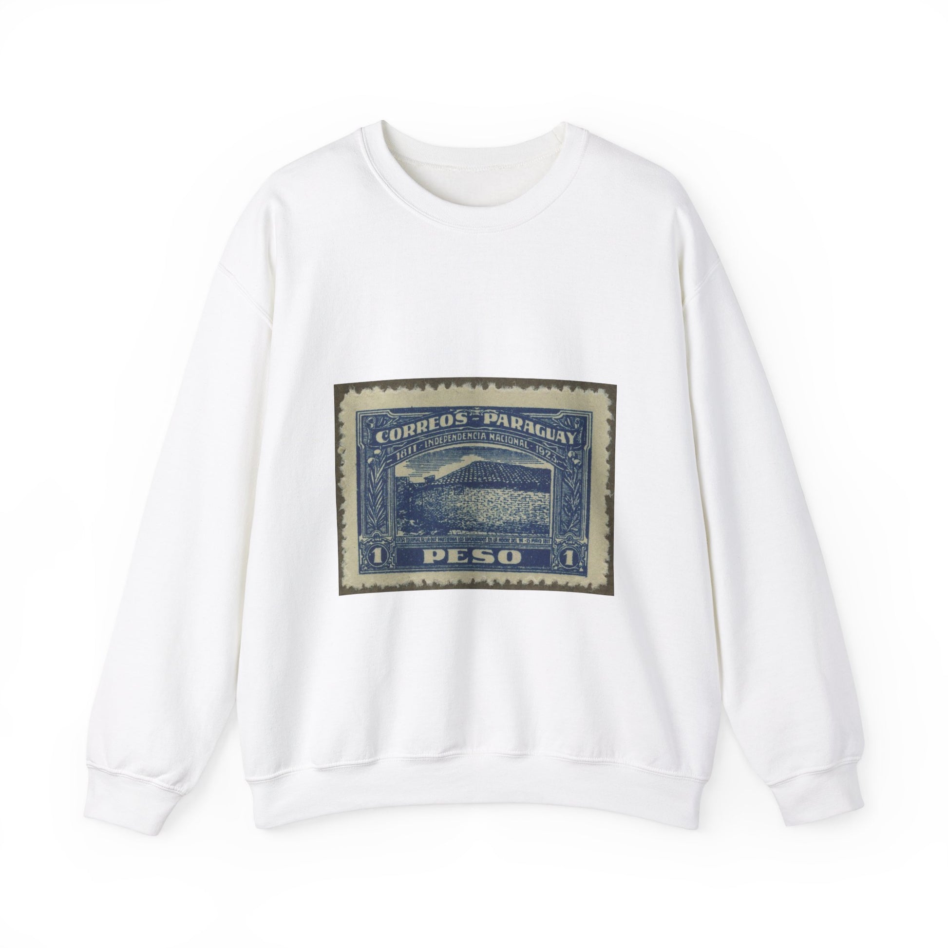 Frimärke ur Gösta Bodmans filatelistiska motivsamling, påbörjad 1950.Frimärke från Paraguay, 1923. Motiv av sammansvärjningsbyggnad. "112-årsminne 15 maj 1811, Paraguays självstyre". White Heavy Blend Adult Crew Neck SweatShirt