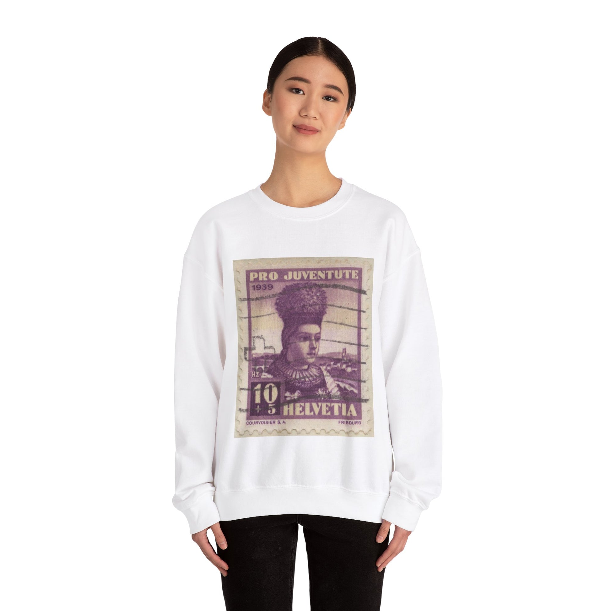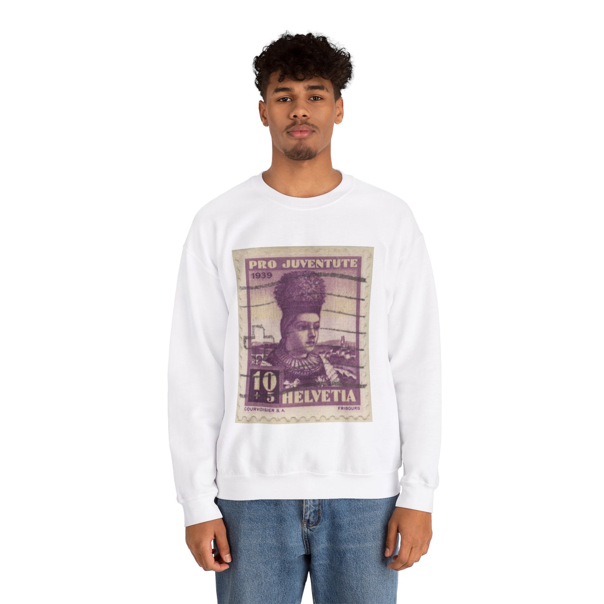 Frimärke ur Gösta Bodmans filatelistiska motivsamling, påbörjad 1950.Frimärke från Schweiz, 1939. Motiv av kvinnodräkt, Freiburg. White Heavy Blend Adult Crew Neck SweatShirt