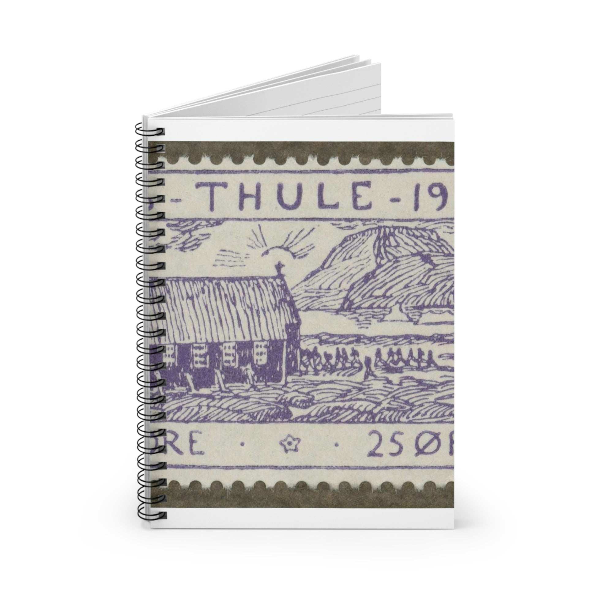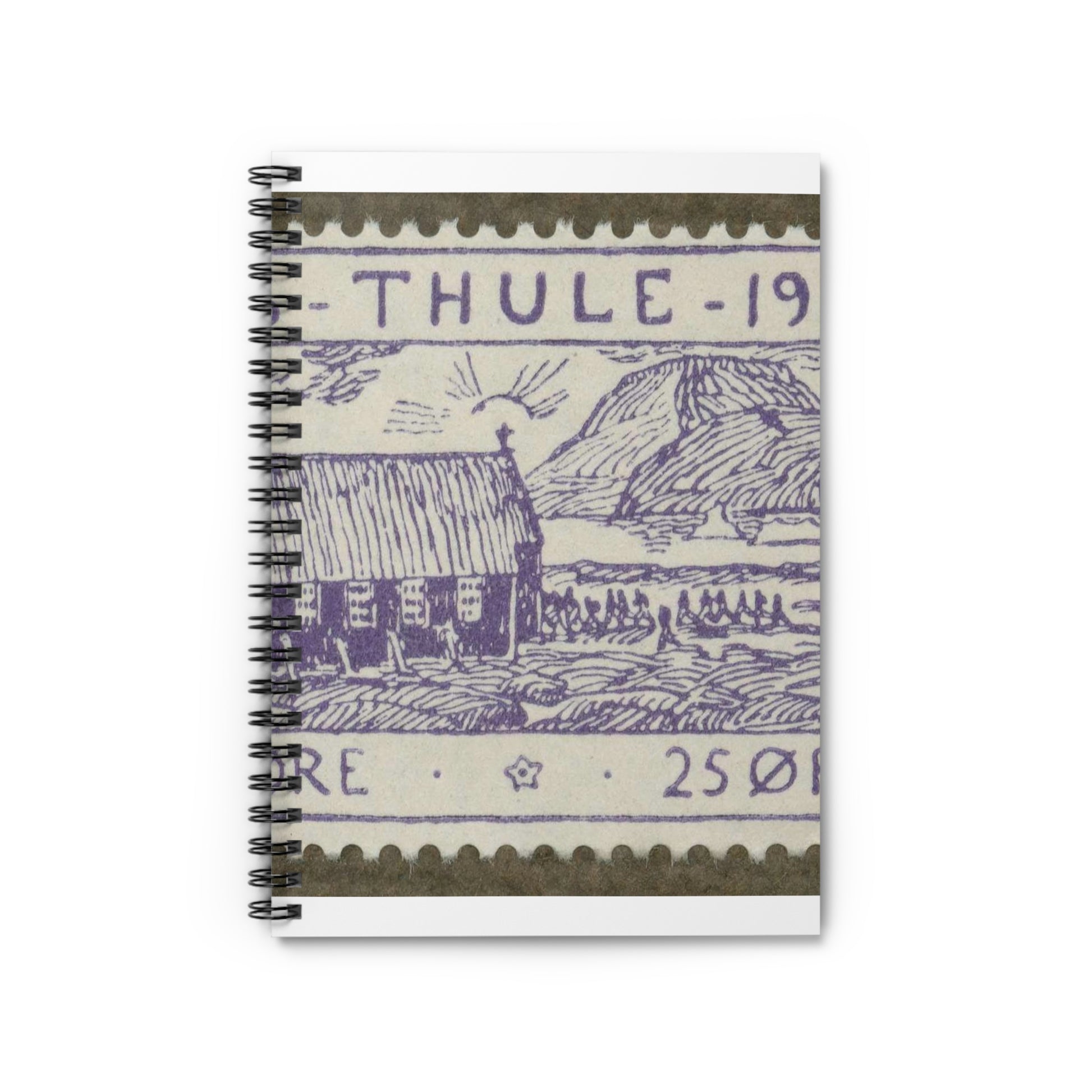 Frimärke ur Gösta Bodmans filatelistiska motivsamling, påbörjad 1950.Motiv av byggnad i Thule-kolonien, Nordvästra Grönlamd, 1936. Spiral Bound Ruled Notebook with Printed Cover
