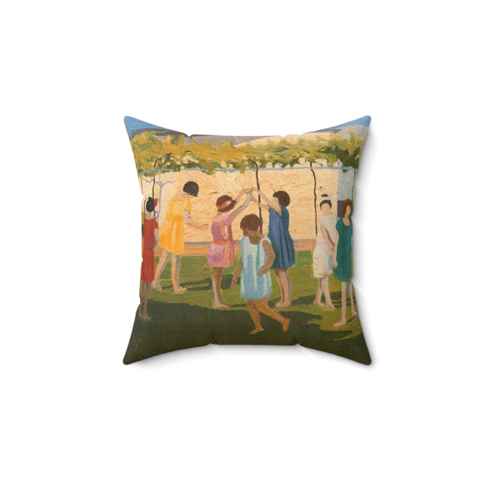 Petrona Viera - A painting of a group of children playing with a kite Decorative Accent Square Pillow
