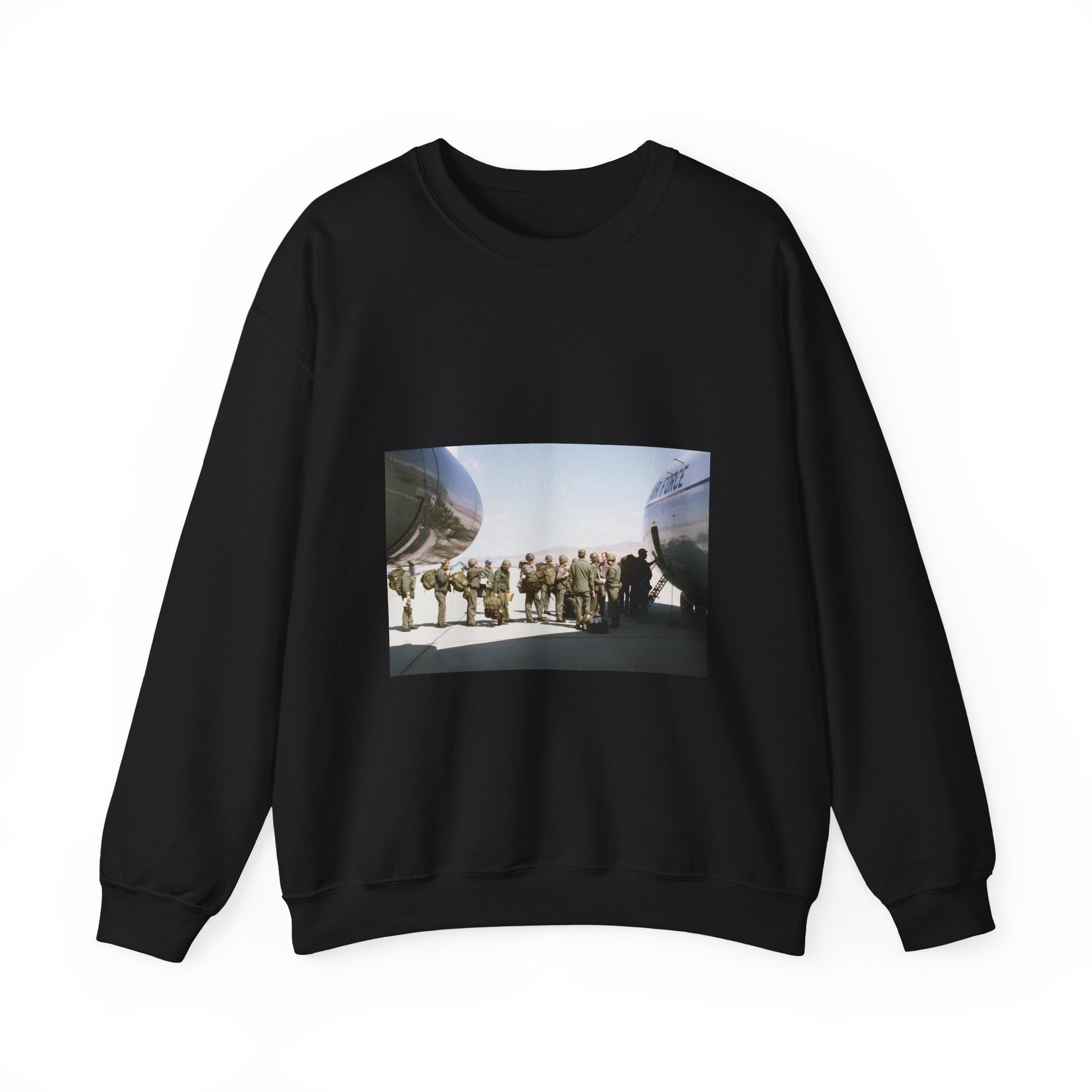 Troops embark a C-141 Starlifter aircraft during exercise Team Spirit (Coronet Spray) Black Heavy Blend Adult Crew Neck SweatShirt
