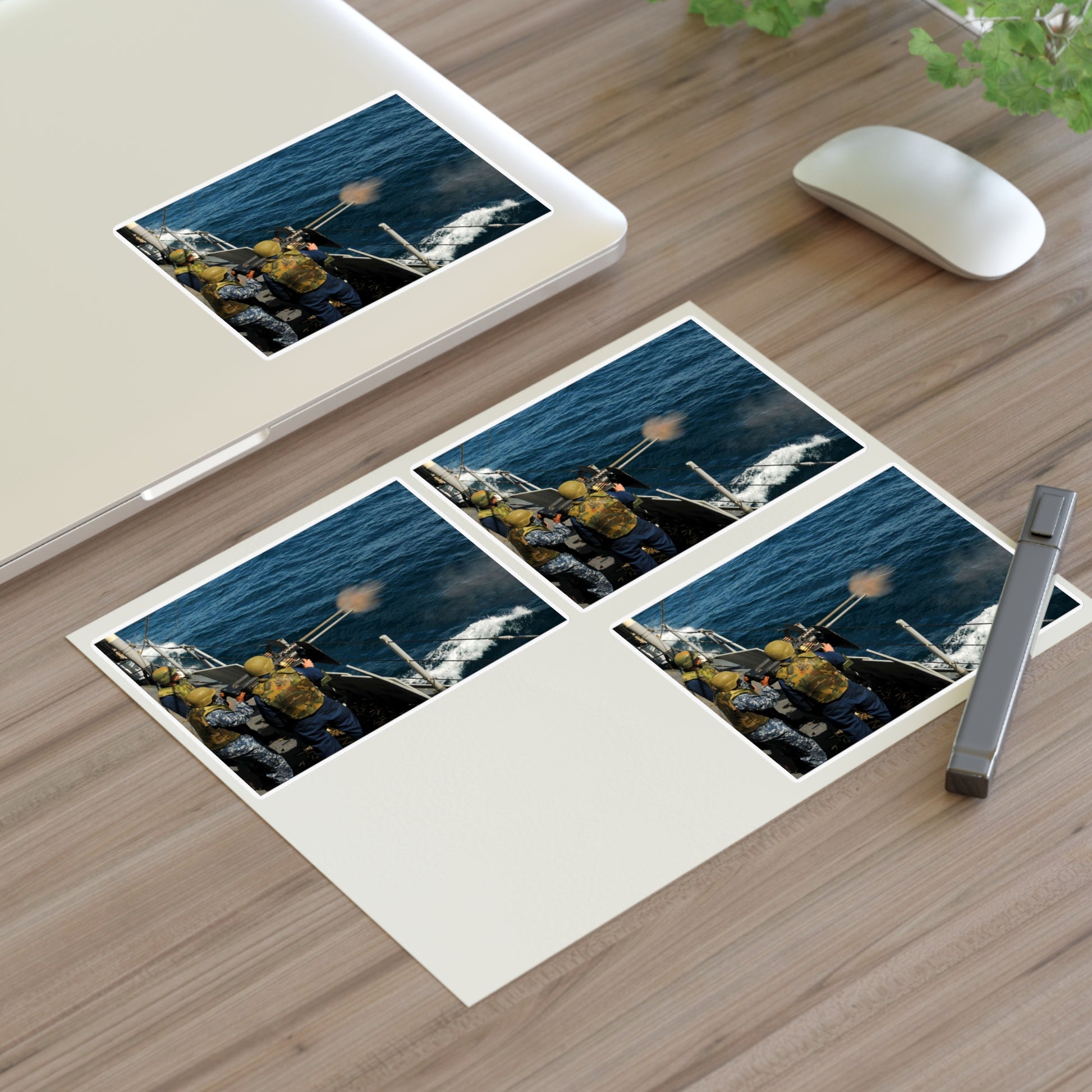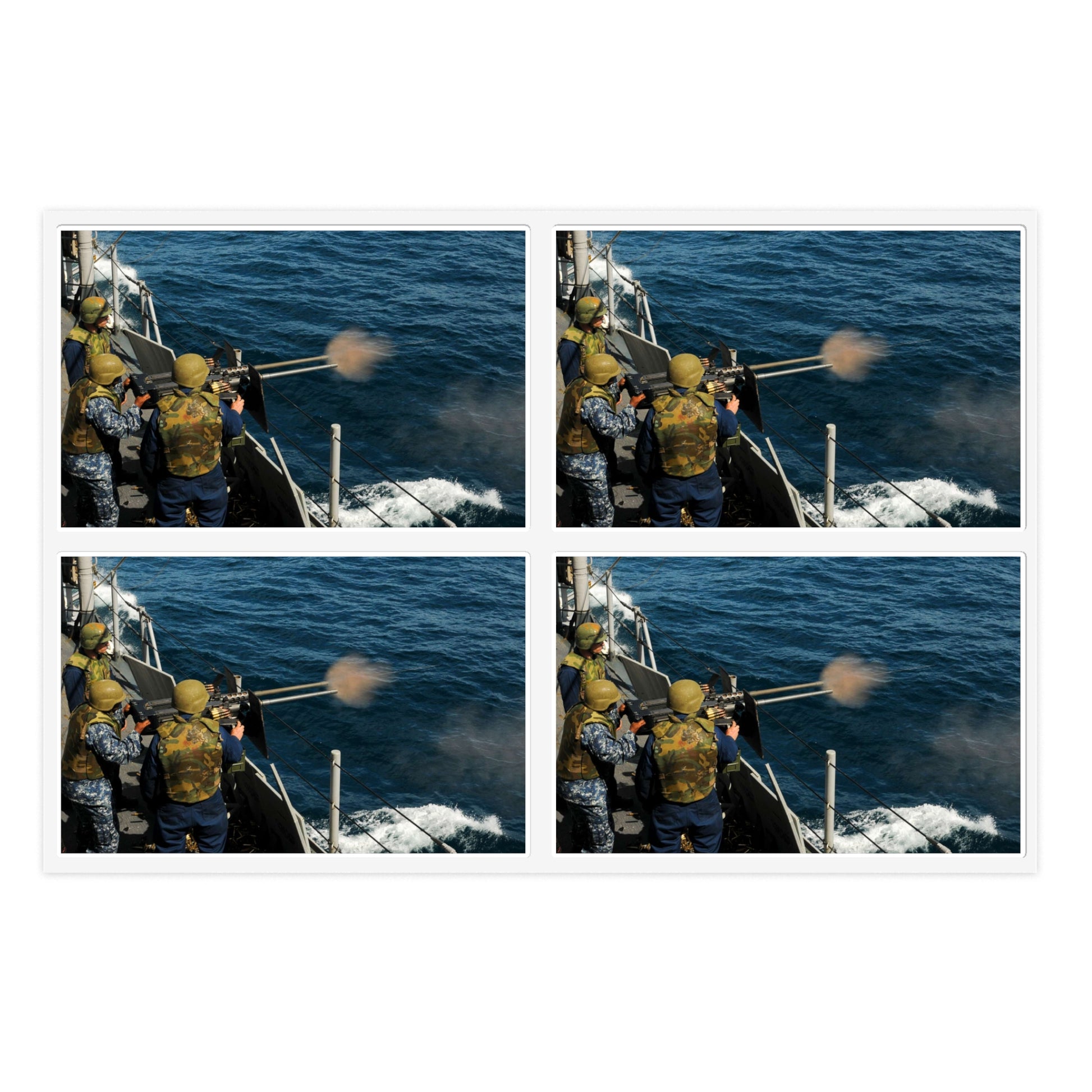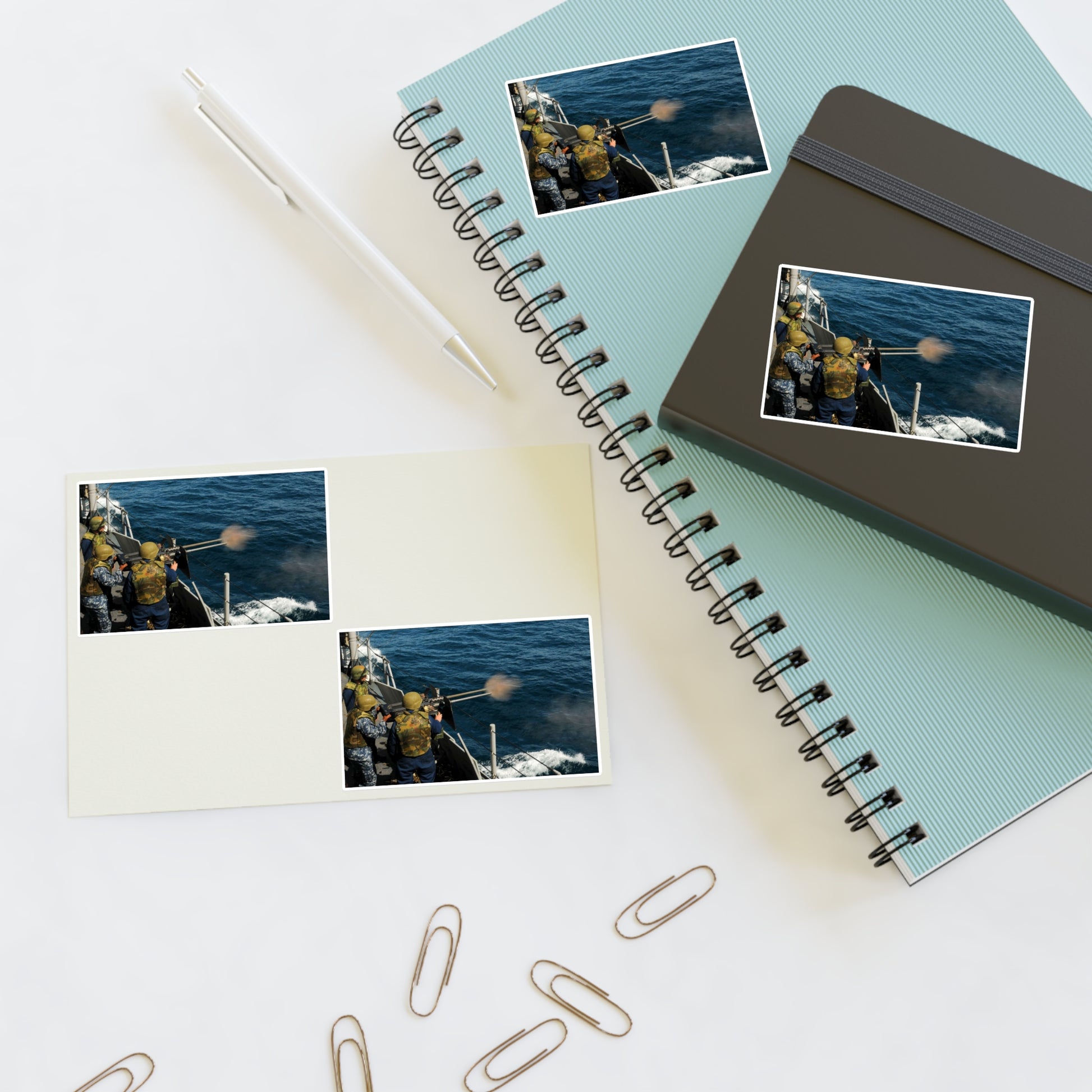 US Navy 110514-N-YM590-214 Gunner's Mate 2nd Class Charles H. Talbert fires a .50-caliber machine gun during a crew-served weapons certification ex Laminated UV Protective Vinyl Stickers